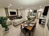 room with entertainment centre & linear fireplace. Island kitchen with maple cabinets, quartz counters, eating bar and corner pantry. Spacious Dining area w/patio doors to backyard. Main floor includes 9' ceilings w/larger windows and plank floors. Open staircase leads you to the 2nd floor with 3 bedrooms and a large laundry. Primary bedroom complete offers a 3 piece Ensuite with 5' shower & 6' vanity and a walk-in- closet. Basement with large windows (enough for egress), rough-in for 3 pce bathroom and full 8' ceiling height! APPROVED FOR THE NEW FEDERAL 5% NEW HOME REBATE PROGRAM – approx $23K cash back to first time Buyers upon closing. Conditions apply. Quality Construction: