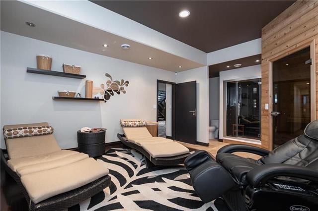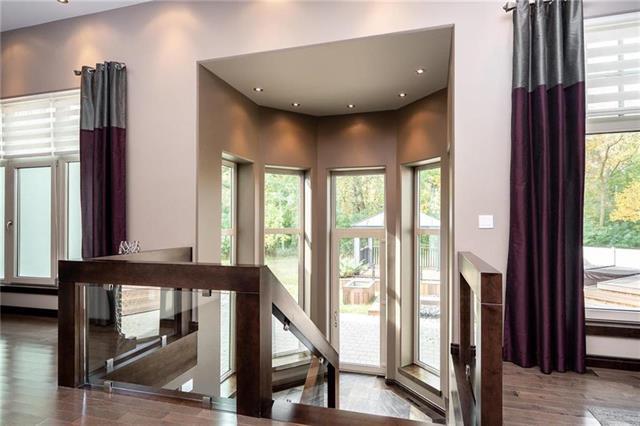 Historic River Road A rare opportunity to own a European-inspired custom bungalow on 1.81 acres of picturesque property, offering over 6,350 sq. ft. of refined living space in a peaceful, tree-lined setting. Grand living & dining areas showcase rich stone accents, custom millwork, soaring 10–12’ ceilings, a cozy gas fireplace—ideal for elegant entertaining. The gourmet kitchen is a showpiece with dual quartz islands, premium Miele appliances, and a sun-filled 4 season sunroom that opens to a tiered deck complete with hot tub and gazebo. The luxurious primary suite is a private retreat featuring a spa-inspired 6-piece ensuite and an impressive walk-in closet. The fully finished lower level offers exceptional versatility with a state-of-the-art home theatre, sleek bar and recreation area, office, 2 spacious bedrooms with walk-in closets, a designer bath, plus a full spa area with steam shower and sauna. Built to the highest standards with ICF construction from basement to trusses and geothermal heating for superior comfort and efficiency. Beautifully landscaped grounds, a triple attached garage, quiet cul-de-sac location just minutes to city amenities. Truly a one-of-a-kind residence.