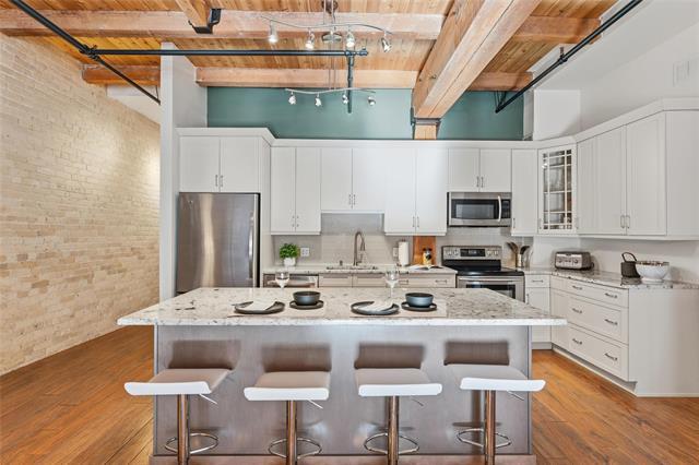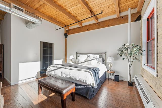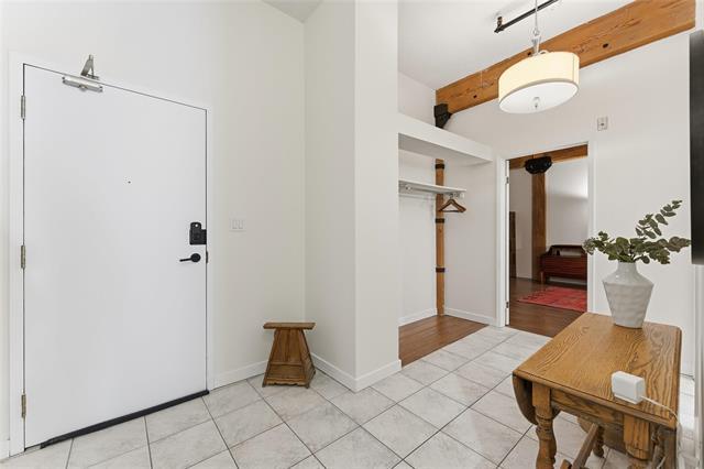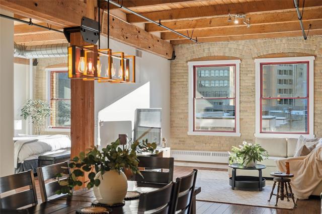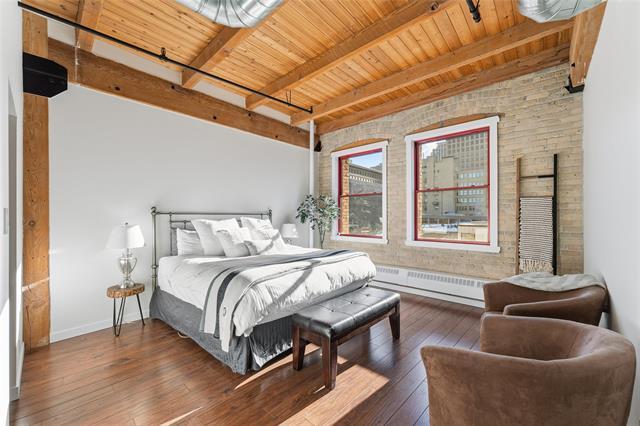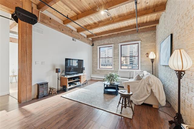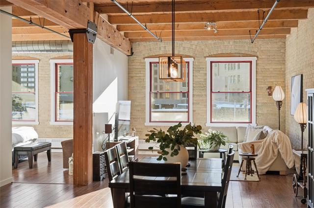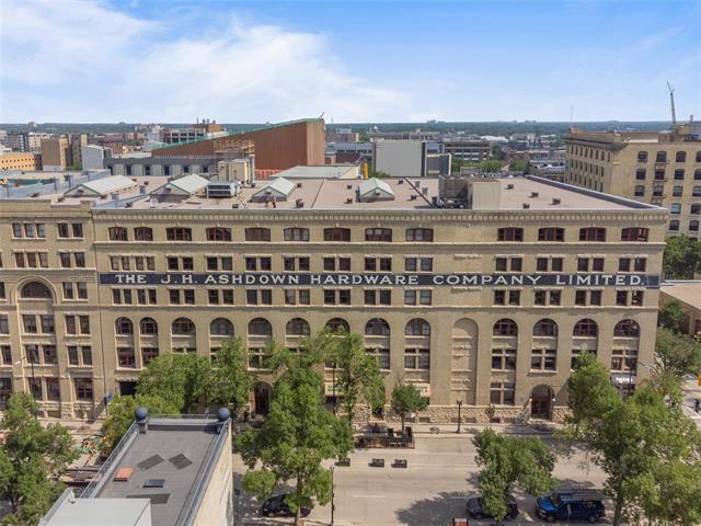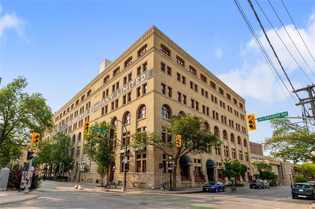 Wow! If you are looking for space, look no further! This expansive Loft condo has almost 1800 sq ft on one level and will not disappoint! One of only 5 of the largest units out of 100 condos in the ever so popular Ashdown Warehouse! Located in the heart of the Exchange District this well established condo corp since 1987. South facing and absolutely flooded with light as there are 4 large South facing windows to let the sun shine in! Incredible downtown views! Gorgeous walls of reclaimed brick! Beautiful upgrades throughout this condo! Kitchen has been completely redone and expanded with tons of cabinet space and a huge Island with gorgeous granite! Lots of nice custom touches everywhere such as a coffee bar and a wine bar area with wine fridge! Unique custom cedar ceiling for added aesthetic,additional sound barrier plus enhances the "Loft" feel and accentuates the massive Fir beams! The primary bedroom is bright and sunny with a walkthrough closet/closet systems leading to an ensuite bath*.Second extra large bedroom and bath! Wood floors throughout! Oversized underground heated parking and heat included in condo fees! Pet friendly building! This is one condo you need to come and see for yourself!