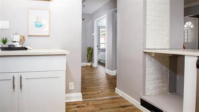 Tastefully updated kitchen is designed to impress with quartz countertops, bright white shaker cabinets, & stainless steel appliances—a perfect combination of modern style and practicality for cooking, entertaining &, everyday living.