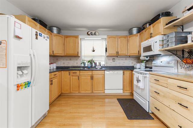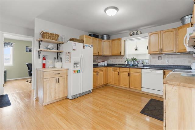 Showings start March 30, offers reviewed April 6. Attention all first time home buyers! Make this property your new address starting this spring. Just over 1100 sq.ft. Spacious solid wood eat-in kitchen includes all appliances. Large living room anchored by solid wood timber to accent the living space with matching built in entertainment unit. Primary bedroom features double closet and convenient 2pc ensuite. Additional bedroom with walk-in closet ideal for guests or office space. Updated 4 pce bath. Basement space ready for rec room development and additional storage space. Large lot complete with deck, garden boxes and fire pit to enjoy those summer nights. Multiple out buildings. Plenty of storage space in the sheds. Gas furnace, gas hot water tank and central air. Good size double detached garage (20x22) with seperate workshop space. You'll feel like you're living in the country with the convenience of amenities nearby. Come check it out today.